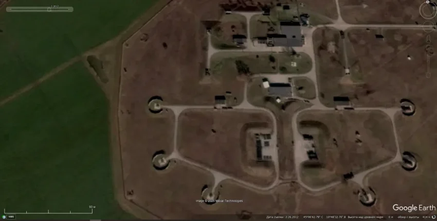 Спутниковый снимок Google Earth: элементы ЗРК MIM-14 Nike Hercules на базе хранения в западном пригороде города Падуя. Снимок сделан в мае 2009 года