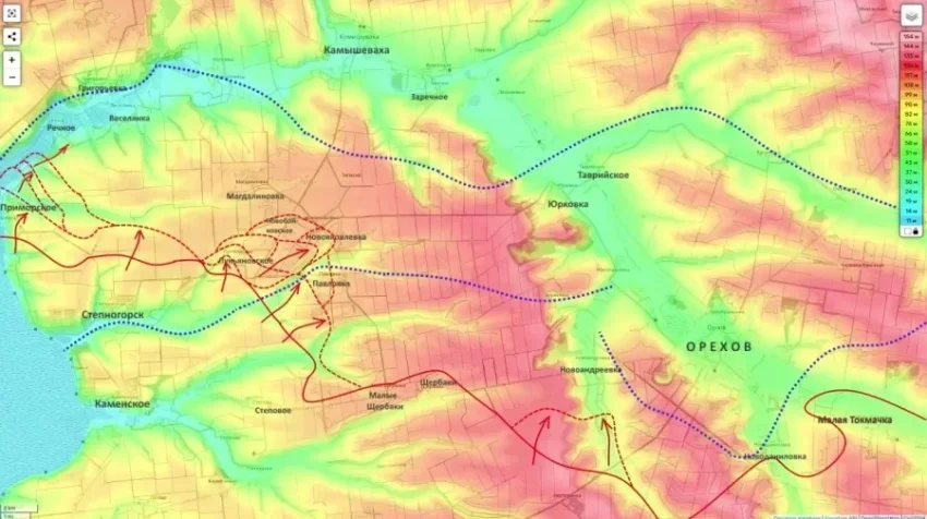 По информации Кимаковского, российская военная группировка осуществляет движение вдоль возвышенностей в направлении глубокого окружения ореховской группировки ВСУ и в сторону Приморского.