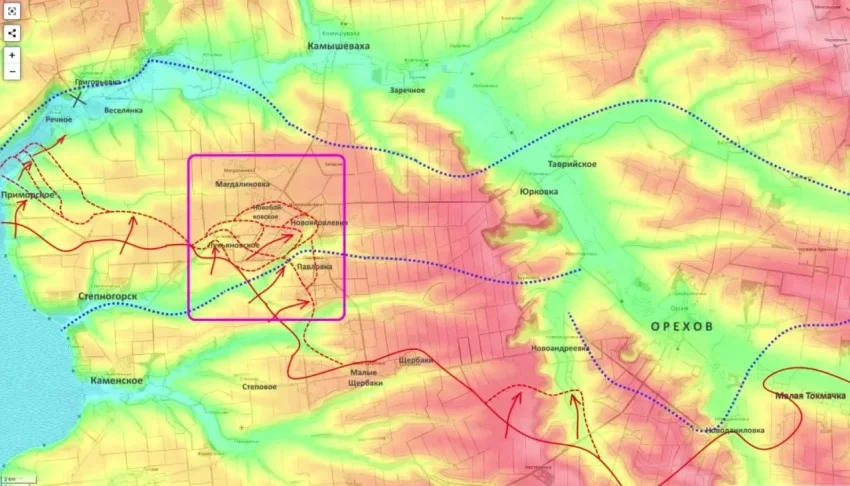 Согласно анализу Подоляки, российское командование реализует классический, но крайне эффективный маневр -создание «левой клешни». Цель операции очевидна: глубокий охват Ореховской группировки ВСУ с последующим выходом на южные окраины Запорожья.