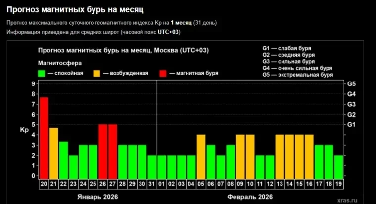 А вот с 26 по 28 января снова прогнозируются магнитные бури, при этом уровень активности может достигать красного уровня до пяти баллов, то есть быть достаточно сильным.