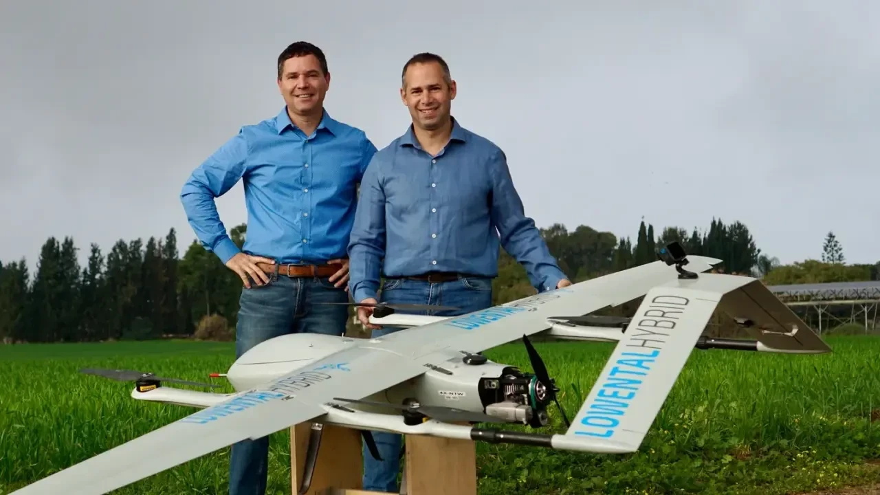 Руководители компании Lowental Hybrid Дорон Фридман (слева) и Итай Ловенталь (справа) демонстрируют опытный БПЛА с двигательной установкой LH-01
