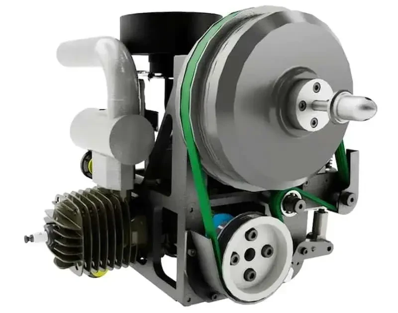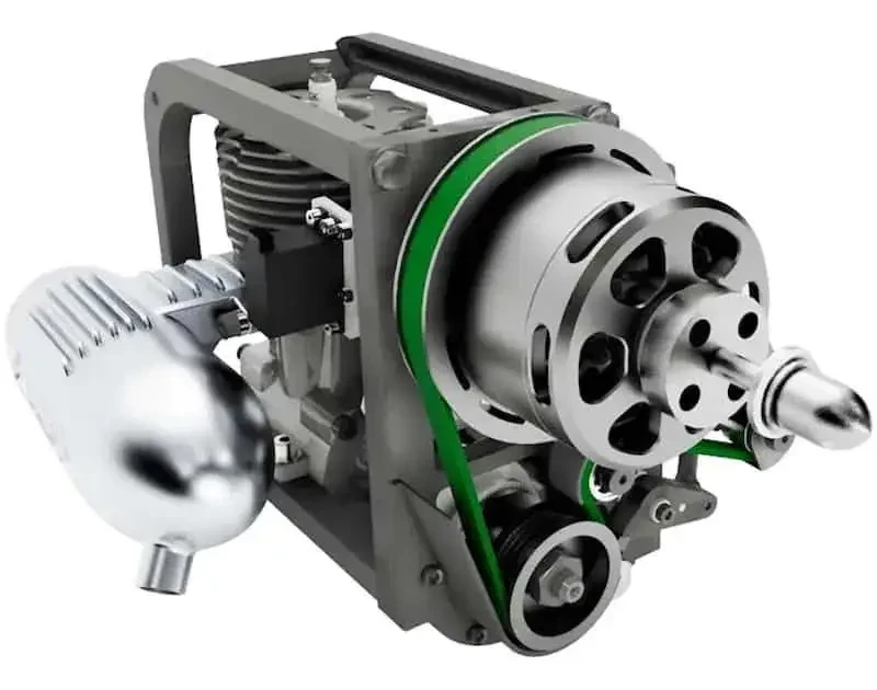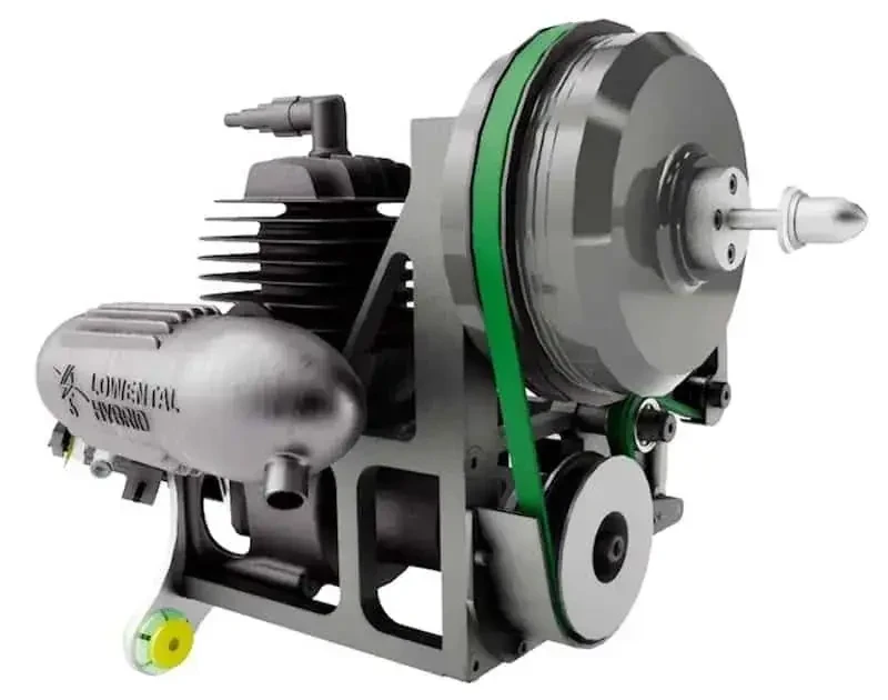 Выше вала ДВС на раме (снаружи) находится ведомый шкив передачи, редуктор оригинальной разработки и соосный с ним электродвигатель, также имеющий функцию генератора. Как и в случае с бензиновыми двигателями, в разных модификациях установки применяются различные моторы с нужным уровнем характеристик. Вал редуктора / электродвигателя используется для установки воздушного винта.