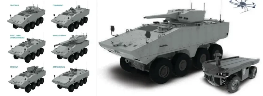 Однако Казахстан закупит плавающую БМП не на новой базе Terrex s5, а на платформе Terrex 2 – предыдущего поколения, но с учётом новых наработок. Этот корпус имеет меньшую массу (около 20-25 т), выдерживает попадание бронебойной пули от патрона 7,62х51 мм и подрыв 8 кг ВВ, не имеет гидропневматической подвески. На местном заводе компании Kazakhstan Paramount Engineering уже прошли модернизацию 200 бронемашин Terrex (вероятно, в интересах армии Сингапура, на вооружении которого состоит 435 единиц более ранних моделей).