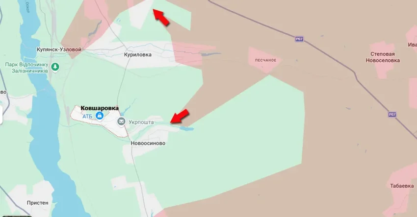 Одновременно с этим фиксируется продвижение Вооружённых сил России в районе Куриловки. Это восточный пригород всё того же Купянска-Узлового.