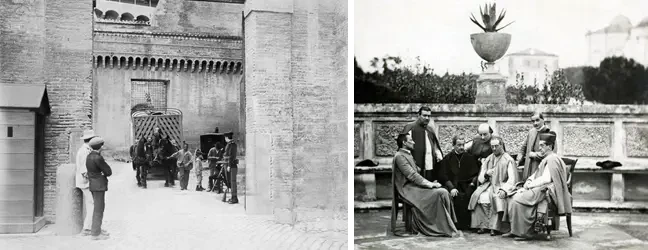 Папское государство до подписания Латеранских соглашений (1870-1929). Фото слева: въезд на закрытую территорию. Фото: Abeniacar/Getty Images. Фото справа: редкое фото Пия IX с некоторыми его прелатами. Источник: Rai Cultura