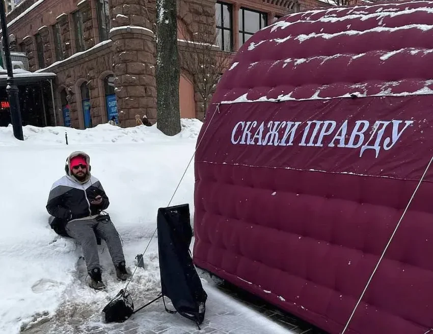 Спрашивается, а что народ, безмолвствует? Нет, «протестует», но как-то по-своему. На фото: центр Киева, Крещатик. Акция «Скажи правду», организованная местным изданием. Любой может прийти к специально установленной палатке с микрофоном и камерой, куда может зайти каждый желающий и в течение одной минуты поделиться своими мыслями. Наверное, еще и погреться. Хотя одна минута — маловато.