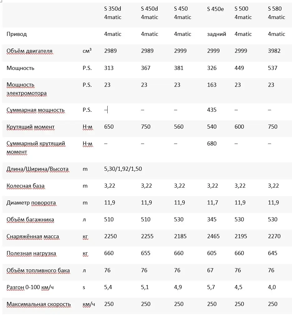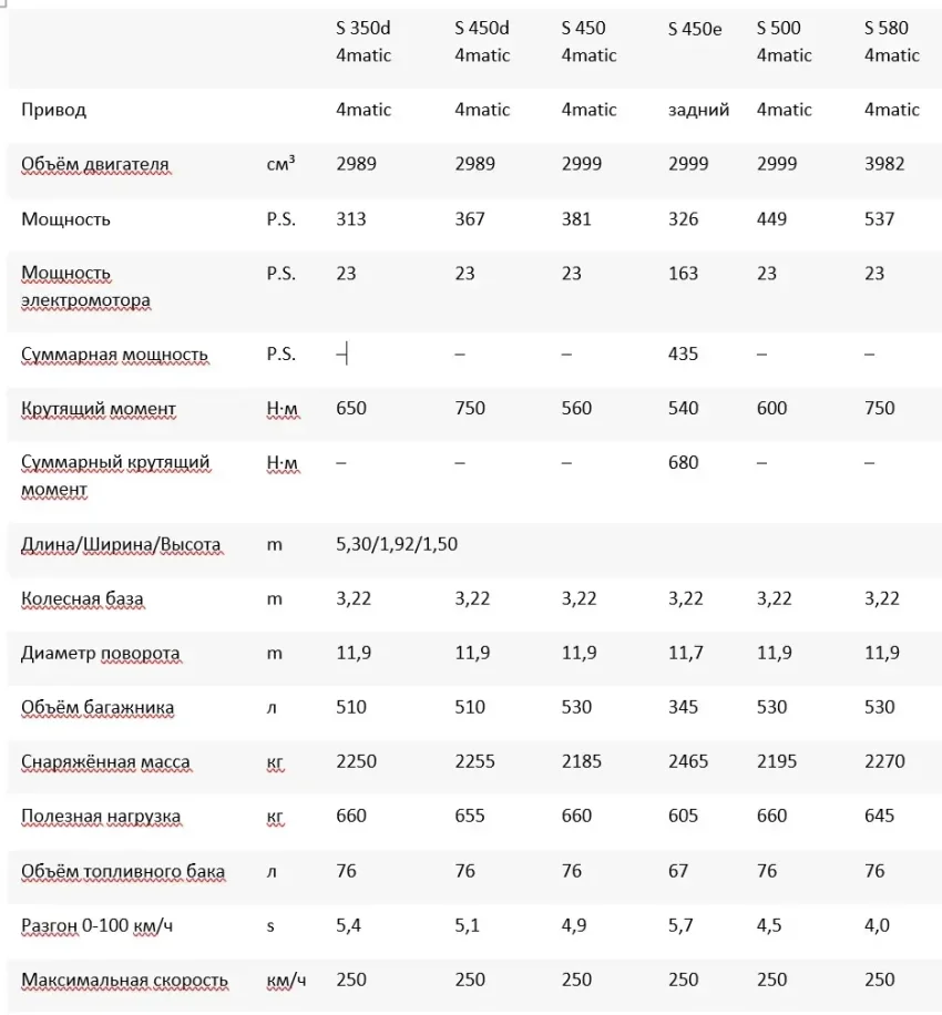 Технические данные S-Class long (V223) 2026 года