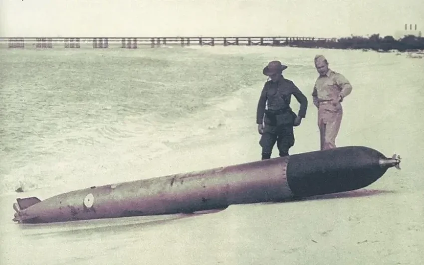 Торпеда G7e обнаружена на пляже возле причала «Eagle» морским патрулем после атаки утром 16 февраля