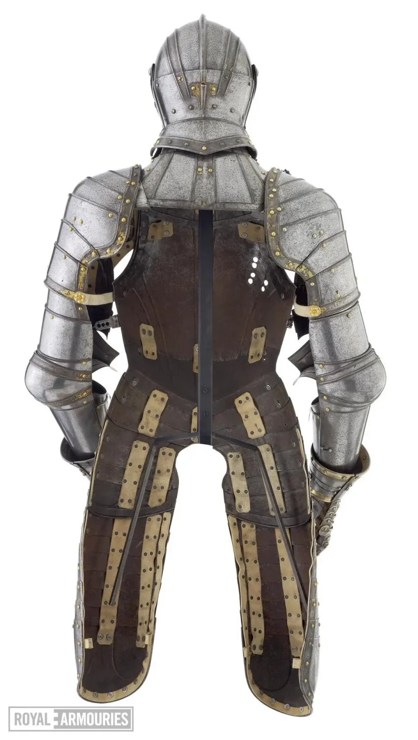 Набедренники выполнены отдельно от «юбки» кирасы, что для трехчетвертных доспехов не характерно. На кирасе видны два отверстия для копейного крюка, но самого его нет. Вполне возможно, что данные доспехи являются «модернизацией» более старого латного комплекта.