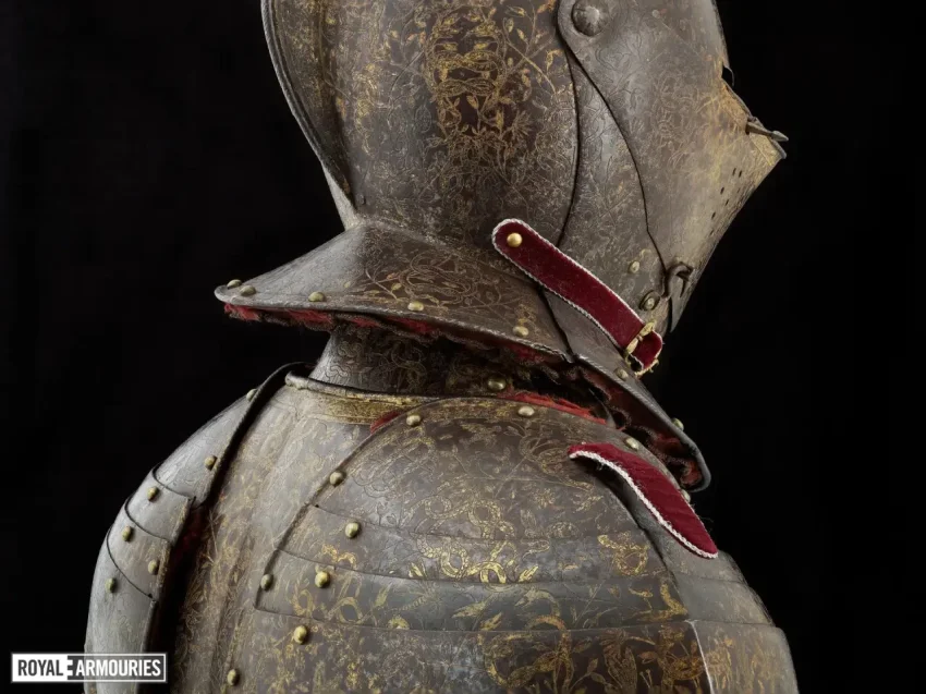 На каждом плече есть ремень для крепления наплечников. Нагрудник представляет собой цельную тяжелую пластину выпуклой формы, напоминающую гороховый стручок, с острым срединным килем и широким фланцем на талии, с центральным выступом. Задняя пластина, плавно повторяющая форму позвоночника, имеет широкий фланец на талии. Спина и нагрудник крепятся ремнями на каждом плече к простым позолоченным железным пряжкам на плечах нагрудника, а также ремнями на талии с обеих сторон талии задней пластины, застегивающимися на литую латунную пряжку, аналогичную пряжке на беворе. Нагрудник имеет четыре ремня для набедренников, задняя пластина — три для кулета — защиты нижней части спины и ягодиц.