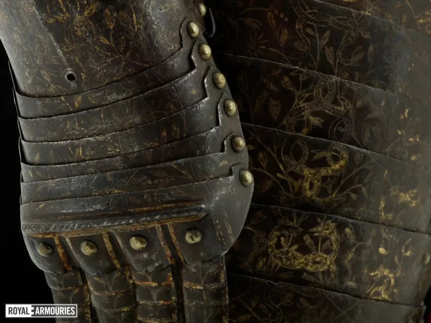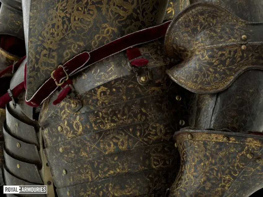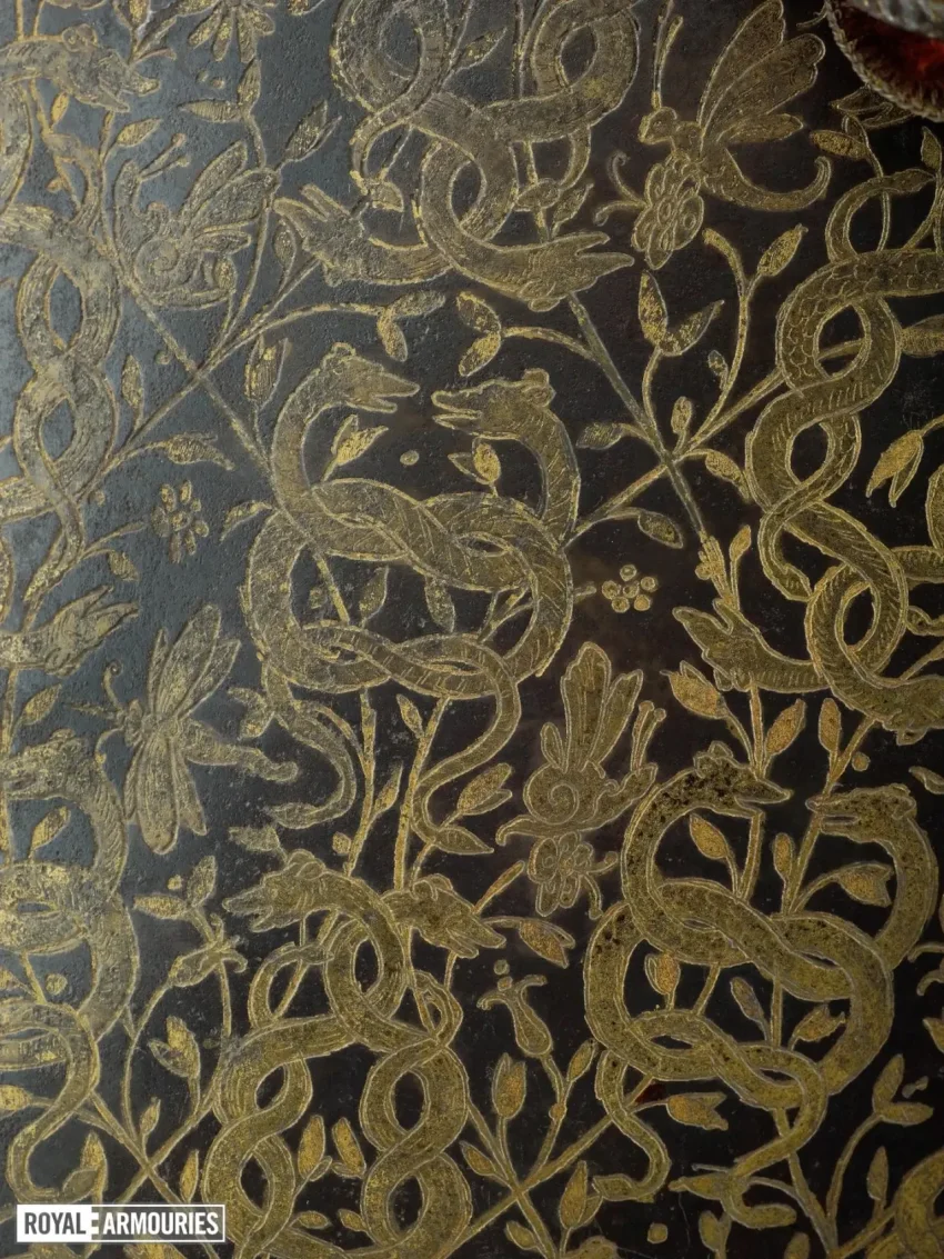 Каждая пластина доспехов украшена травлением и позолотой, на ней изображен общий узор из переплетающихся ушастых змей в вертикальных полосах, соединенных диагонально переплетающимися тонкими лиственными листьями с редкими цветами, среди которых сидят хищные птицы, летающие попугаи, различные насекомые, включая кузнечиков и стрекоз, улитки (некоторые крылатые), длинноухие белки и резвящиеся зайцы.
