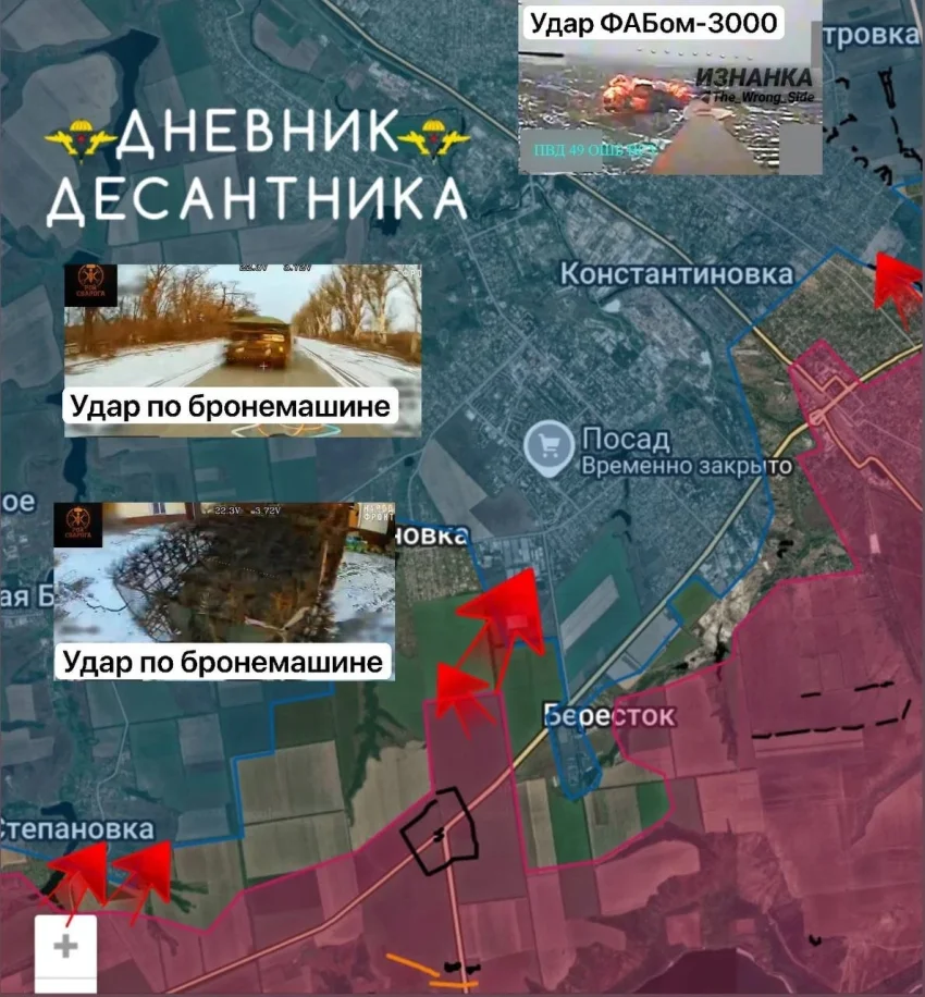 Наши штурмовики продвигаются на рубеже Степановка - Бересток, заняли новые позиции у Новодмитровки и Червоного. К северу от Часов Яра идет продвижение от Новомарково к Тихоновке.