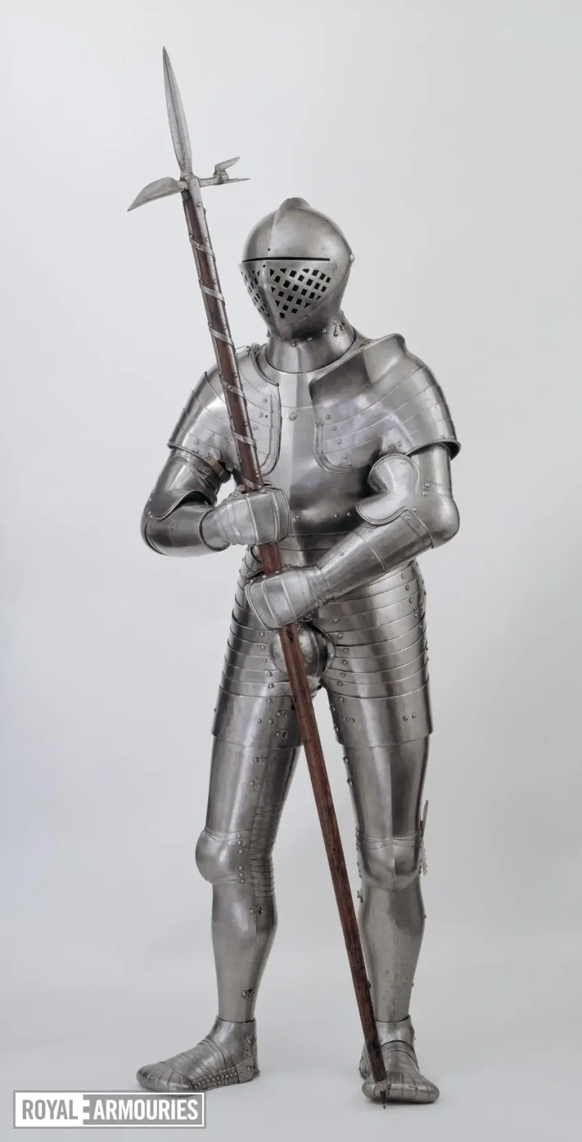 Наплечники из перекрывающих друг друга пластин стали отличительной особенностью мастерской в Гринвиче. Левый (если смотреть спереди) наплечник состоял из восьми полос, а вот правый почему-то из семи. Юбка состоит из девяти полос, как спереди, так и сзади. Петли на ней находятся слева, пряжки ремней справа. Латы для ног могли быть изготовлены в Италии или во Фландрии. Их попросту взяли от какого-то старого доспеха.