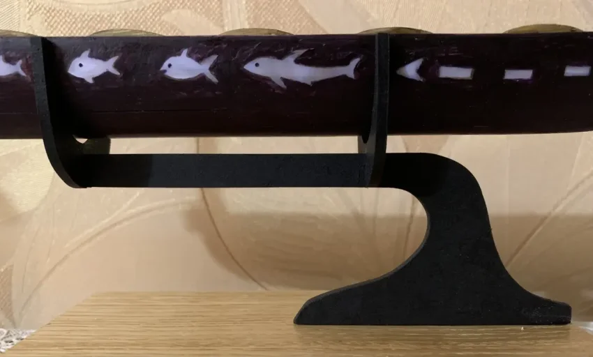 Вырезались фигурки из перламутрового диска так: сначала по периметру насверливались отверстия диаметром 0,5 мм, затем они рассверливались сверлом толщиной 1 мм. Вырезанные таким образом вставки-фигурки рыб и птицы обтачивались алмазным диском и зубными борами всё той же микродрелью. Диски диаметром 2 мм покупные. Это набор позиционных маркеров для грифа гитары, сделать их самостоятельно я даже и пытаться не стал. Вставки раскладывают на корпусе и обводят остро заточенным карандашом. Места для вставок диаметром в 2 мм лучше рисовать фломастером, используя прозрачную линейку с отверстиями. Тогда все они будут на одинаковом расстоянии друг от друга. Посадочные гнезда под них высверливаются двухмиллиметровым сверлом. Ставить их лучше всего на суперклей так, чтобы они, пусть и немного, приподнимались бы над поверхностью корпуса пироги.