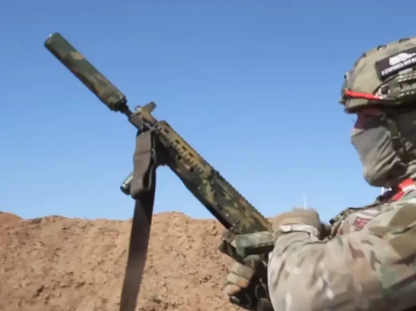 Кадр из видео презентации спецбоеприпасов «Ростехом». Из этого автомата патронами СЦ-226 на дистанции 65 метров был поражён дрон. Хорошо видно, что автомат оснащён «глушителем»