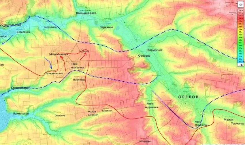 В свою очередь в полосе группировки "Восток" российские подразделения пытаются зацепиться за восточные окраины населённого пункта Верхняя Терса, где важно занять опорные пункты для дальнейшего охвата Орехова уже с востока и северо-востока.