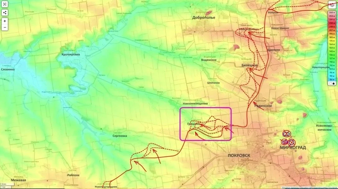В свою очередь на участке группировки «Центр» идут тяжёлые встречные бои. Российские подразделения опираются на Ивановку и предпринимают попытки выйти к восточным окраинам Гавриловки. Однако основные события разворачиваются севернее - в районе Покровска, Мирнограда и Белицкого.