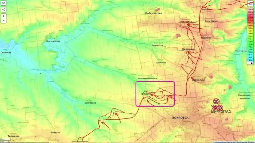 За Гришино продолжаются ожесточённые бои. По имеющимся данным, до половины населённого пункта находится под контролем российских сил, остальная часть остаётся в так называемой серой зоне. Если этот населённый пункт будет полностью взят под контроль, это может изменить положение между Белицким и Сергеевкой и осложнить ситуацию для украинской группировки в районе Доброполья.