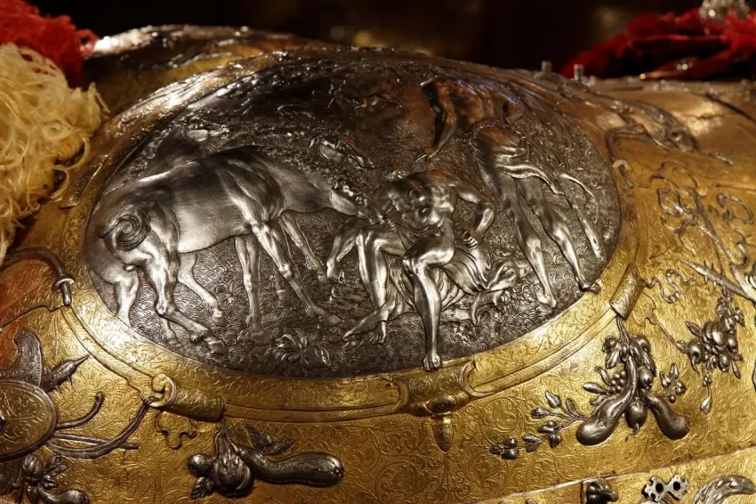 Сюжет медальона на круппере слева: великан Какус похитил у Геракла четырёх быков и четырёх телиц из стада Гериона, и, чтобы запутать следы, втащил их за хвосты в свою пещеру, чтобы по следам можно было думать, что животные вышли из пещеры, а не вошли в неё. Геракл нашёл Какуса спящим, услышав мычание коров, увел их из пещеры, а самого Какуса задушил