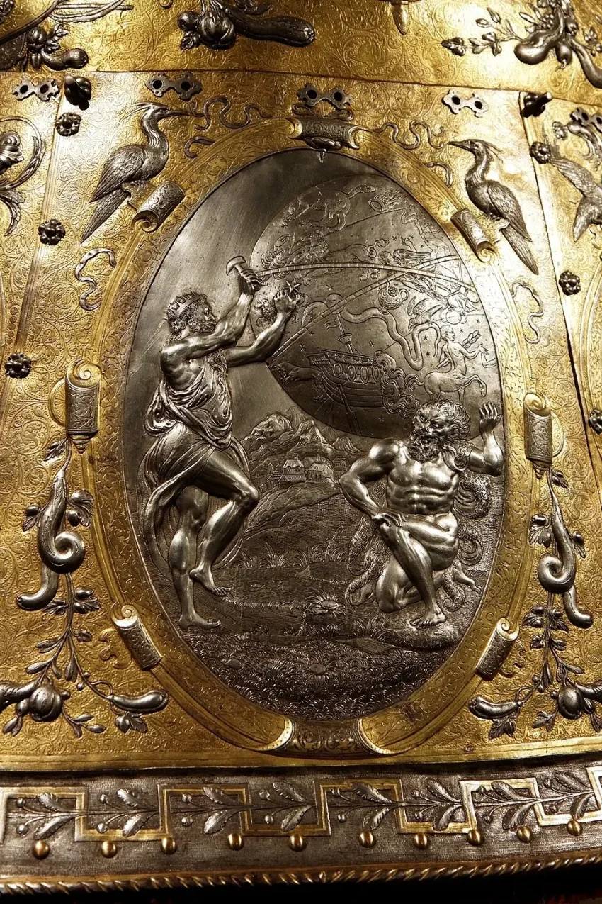 Доспехи эти представляют собой полный гарнитур, включающий и сам доспех для всадника, и абсолютно полный бард, то есть доспехи для коня. По сути дела, это даже и не доспех вовсе, а своего рода произведение доспешного ремесла и искусства: «чистейшей прелести чистейший образец» (А. С. Пушкин). Причем, несмотря на самое пышное оформление, какое только можно себе представить, отделаны они с таким вкусом, что в них нет ничего лишнего. Как об этом уже здесь сообщалось, доспех короля Эрика получил название «Доспеха Геракла», а все потому, что основными мотивами чеканных изображений на нем стали 12 подвигов Геракла, а также события из истории Троянской войны и плавания аргонавтов. Причем всю поверхность гарнитура украшает орнамент, и к тому же все его украшения либо позолочены, либо посеребрены. И очень важной деталью являются парные фигурки Пегаса, выбитые на забрале. Это не просто так, не просто фантазия мастера – это еще и «говорящий» символ красноречия владельца доспеха, в котором Эрик по задумке должен был предстать перед королевой-девственницей Елизаветой Английской.