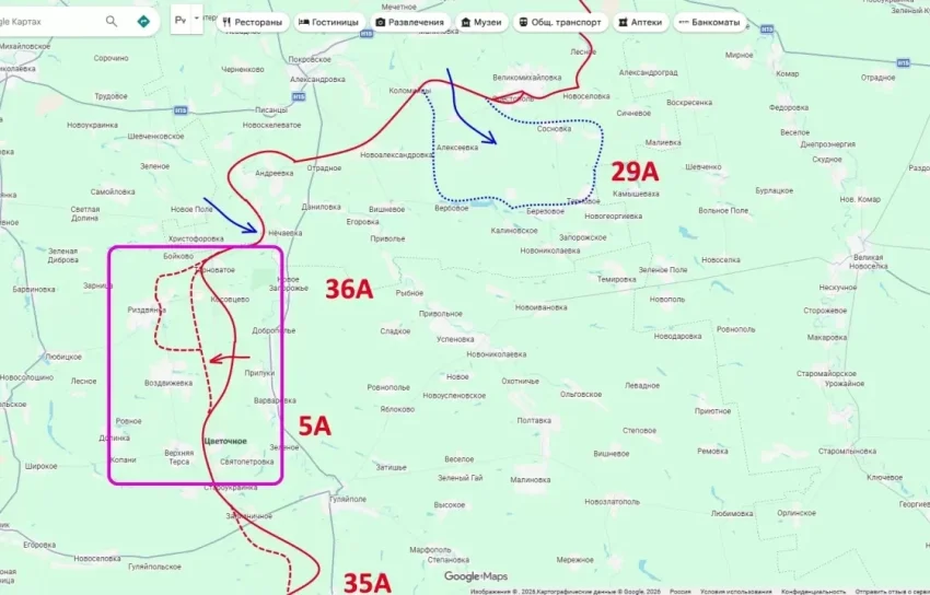 Продолжаются атаки из района Гуляйполя, фиксируется продвижение западнее Железнодорожного. В районе Верхней Тёрсы идут крайне интенсивные боестолкновения. Одновременно в полосе 36-й армии уточнена обстановка по Рождественскому: под контролем российских сил находится восточная часть населённого пункта, бои продолжаются.