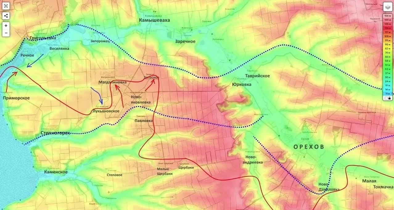 Задача блокировать «фортецию» ВСУ в Орехове поставлена и войскам группировки «Восток». Они наступают от Гуляйполя в сторону Запорожья широким фронтом. Накануне штурмовые отряды «восточных» установили контроль над селом Горькое. Это дает возможность, продвигаясь на запад выйти ещё на одну трассу, ведущую в Орехов с севера. По ней пока также идет подпитка ореховского гарнизона. Перережем её - сможем серьезно ухудшить ситуацию для ВСУ в Орехово.