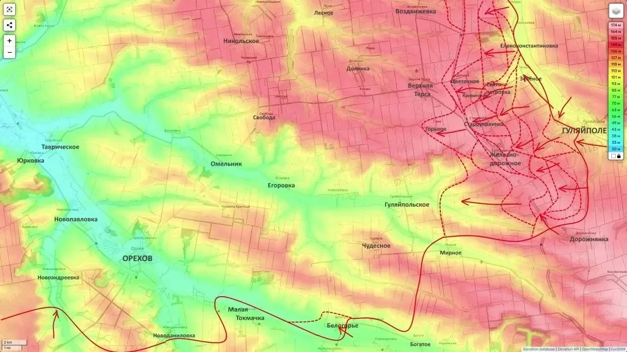 В свою очередь в полосе ответственности группировки войск «Днепр» российская армия прочно удерживает инициативу. В данный момент идут сложные позиционные бои с целью выдавливания противника из районов Магдалиновки и Запасного. Одновременно возобновлено наступление севернее Приморского, вдоль русла реки Конки.