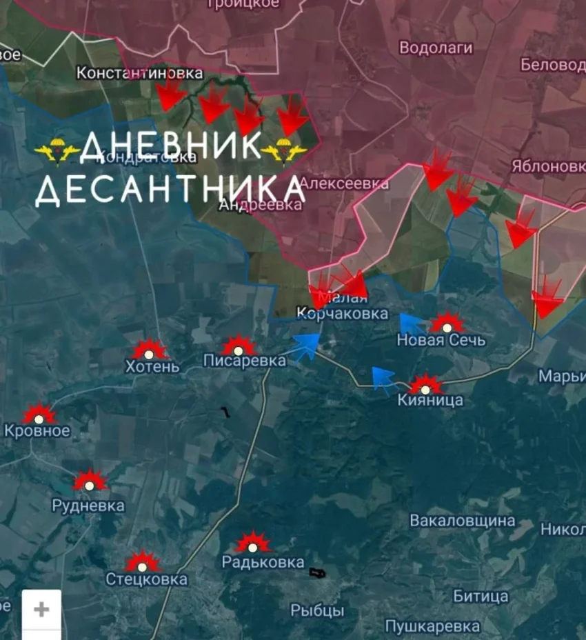 На Сумском направлении на Алексеевском участке идут тяжёлые бои за Малую Корчаковку. В самом селе отмечено скопление крупных сил противника, однако наши мотострелки при поддержке дроноводов методично выдавливают его с занимаемых рубежей.