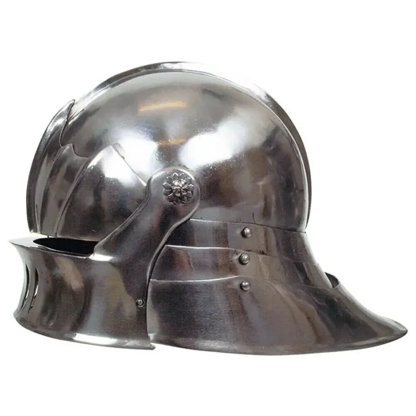 Ну, это что-то уж совсем примитивное. Зато недорого и потом на этот шлем можно прикрепить некие украшения, вырезанные из липовых ламелей и к тому же раскрасить в гербовые цвета. Потом надеваешь гербовое сюрко, под него стеганку и кольчужные совсем короткие нарукавники и… вот ты и рыцарь, ведь никто не не будет проверять – одета на тебе вся кольчуга, или же из под сюрко торчат лишь только рукава?!