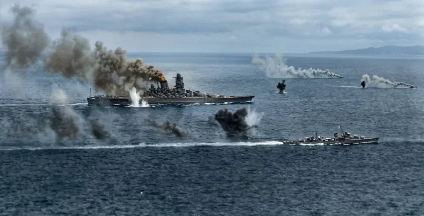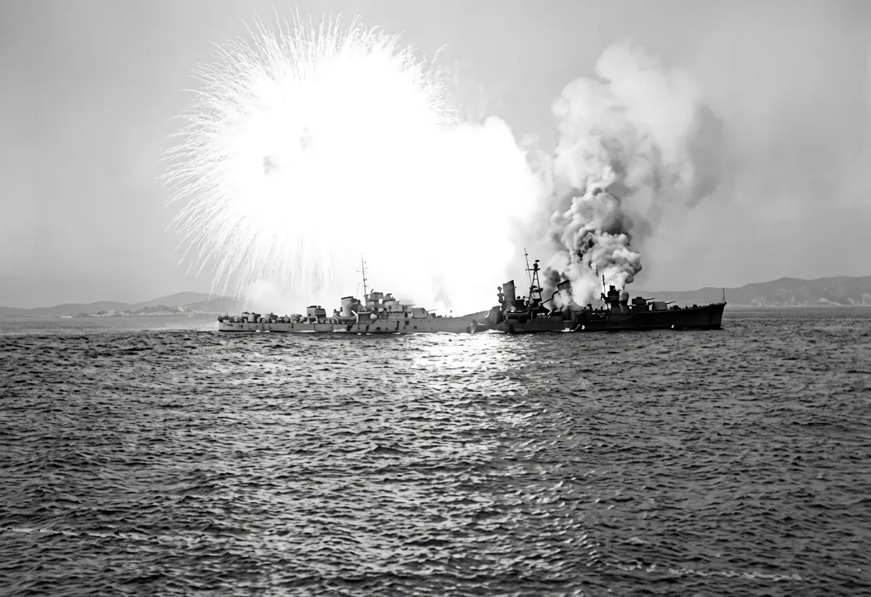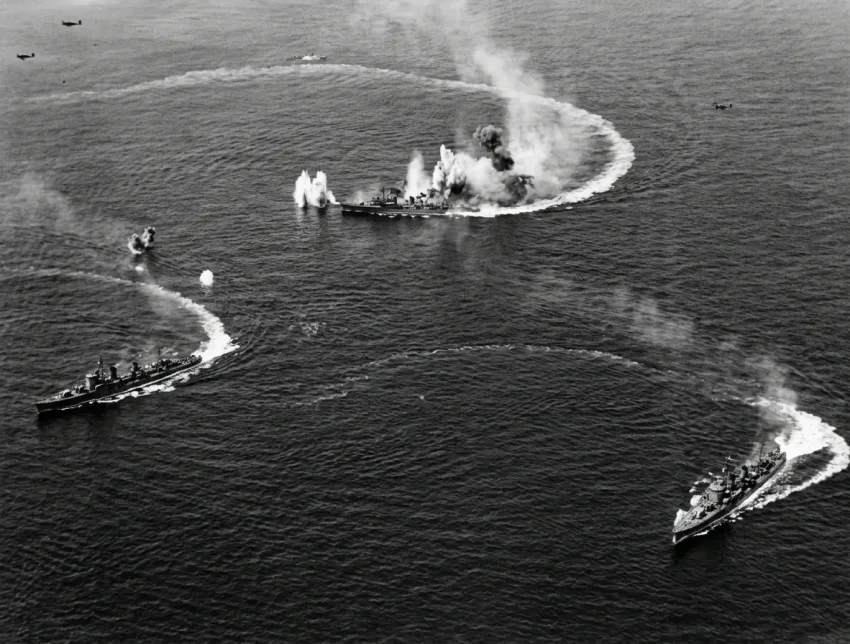 «Дзуйкаку» и «Вакацуки» под обстрелом во время битвы в заливе Лейте, 25 октября 1944 года