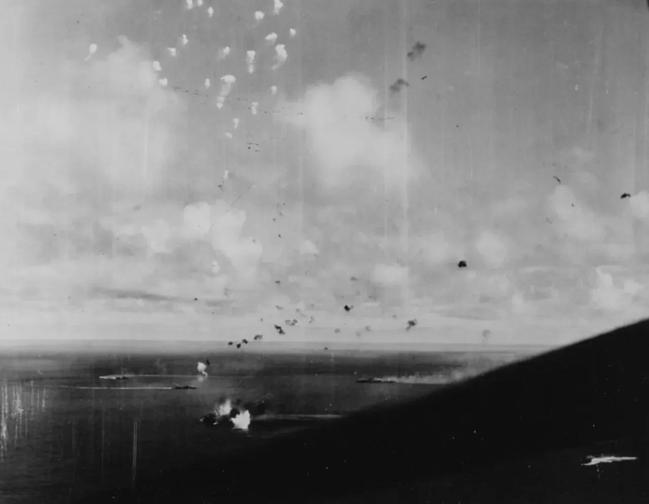 Японский авианосец «Дзуйкаку» во время сражения в Филиппинском море 20 июня 1944 года. «Вакацуки» (слева) и «Акидзуки» (справа) — два эсминца рядом с ним