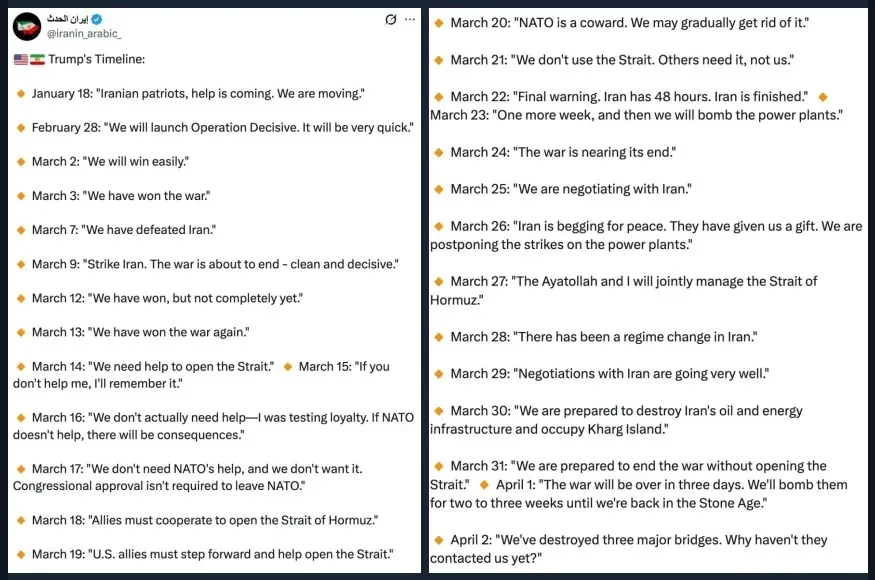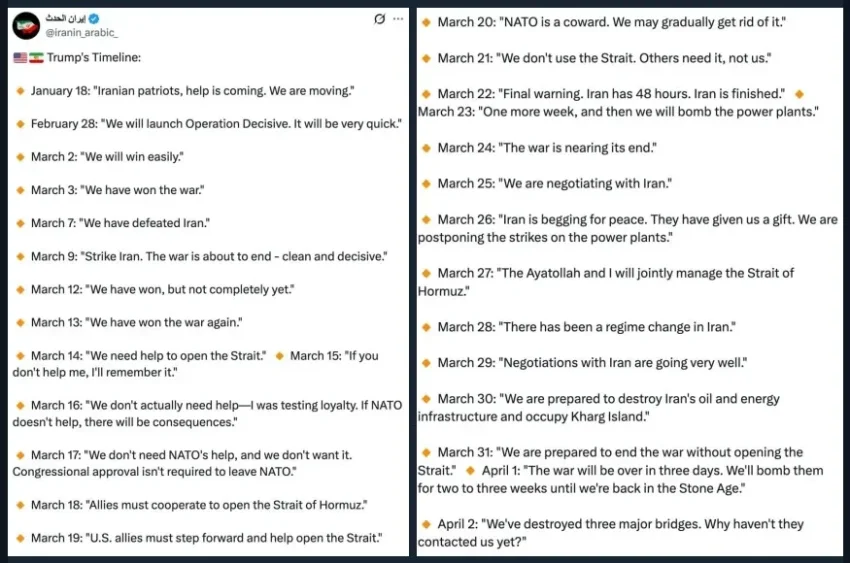 Есть особый жанр литературы — поток сознания. Джойс его изобрёл, Фолкнер довёл до совершенства, а Дональд Трамп превратил в инструмент внешней политики. Представленная хронология — это не стенограмма брифингов Пентагона и не сводка боевых действий. Это партитура. Симфония в сорок один такт, где каждая нота — победа, каждая пауза — отрицание предыдущей победы, а финал, судя по всему, откладывается на неопределённый срок.