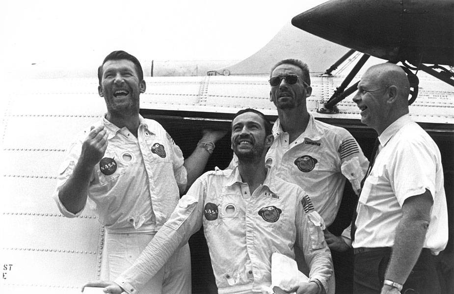 Тем не менее, живых и вполне здоровых астронавтов подняли на борт вертолёта и доставили на авианосец через 56 минут после приводнения, никто из них, в отличие от советских космонавтов, не находился после возвращения в измождённом состоянии (о, «кислород животворящий»).