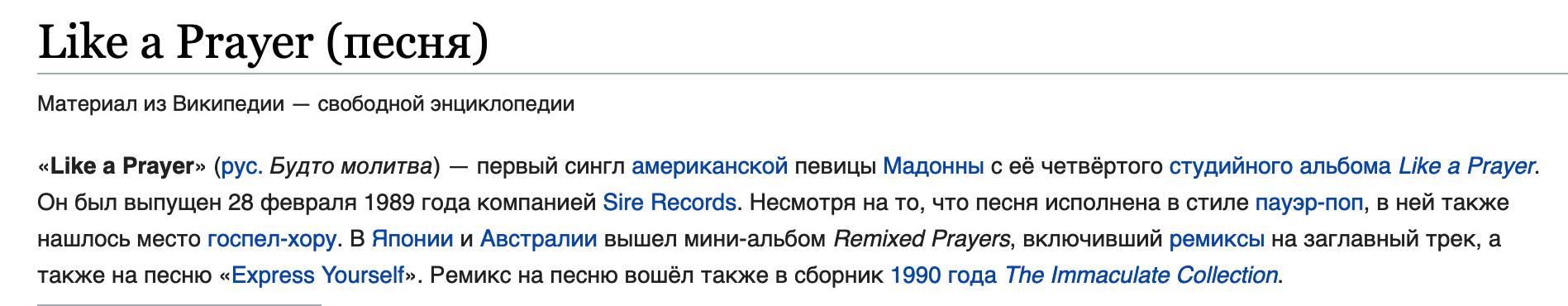 Сейчас я буду говорить именно о выступлении Мадонны. Оно начинается на 2.56.24. Начинается оно с песни «Like a Prayer» ( «Как молитва») изаканчивается песней «Future» (Будущее). О первой песне в википедии следующая информация: