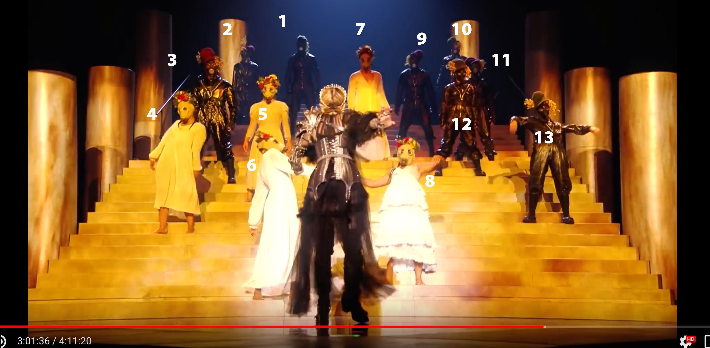 На сцене мы видим монахов в храме. Сцена в красно-чёрных тонах. Слева стоит 20 человек, а справа 18. Если выстроить кол-во по порядку слева на право получаем 2018. То есть прошлый год. Складываем все цифры получаем число 11.