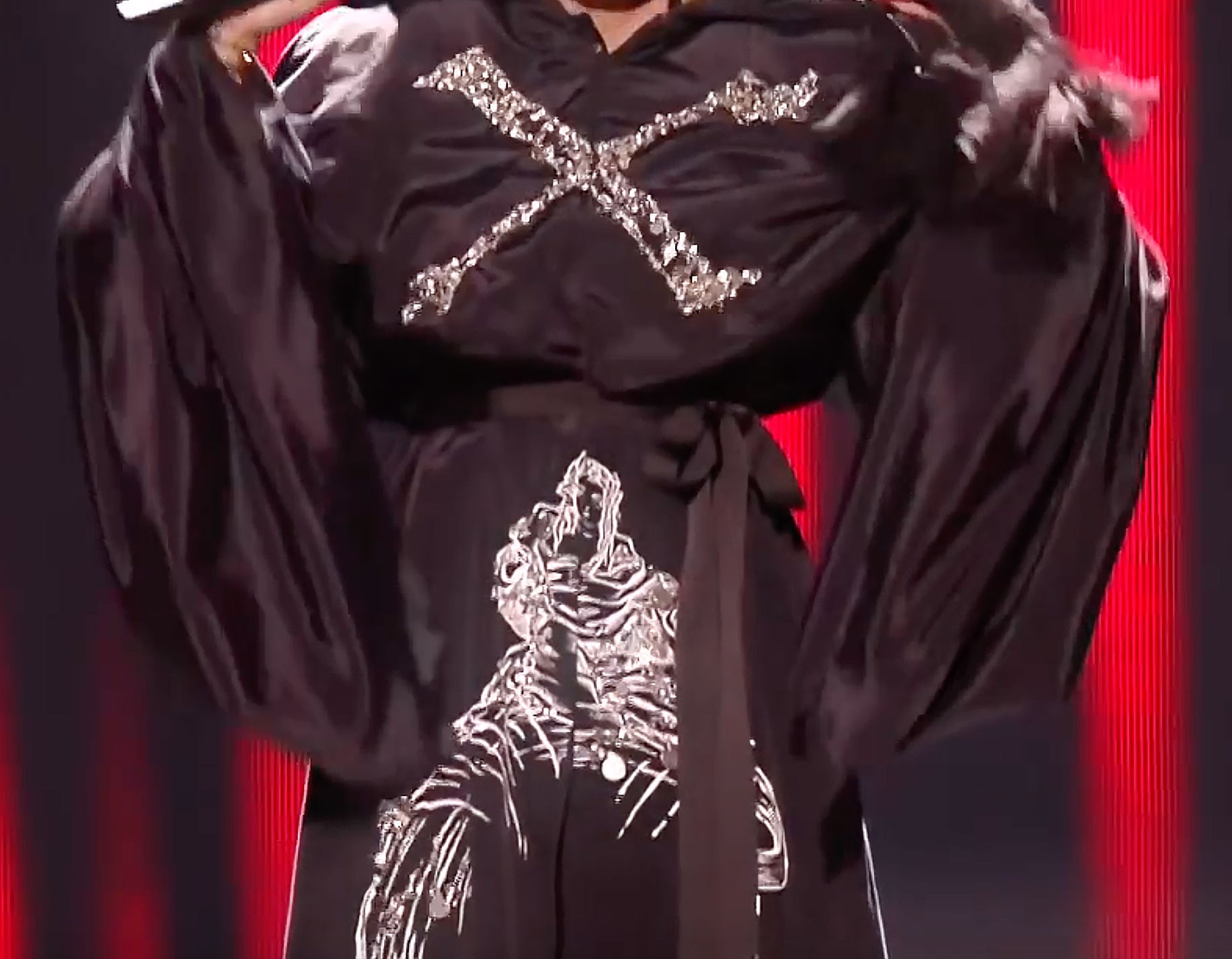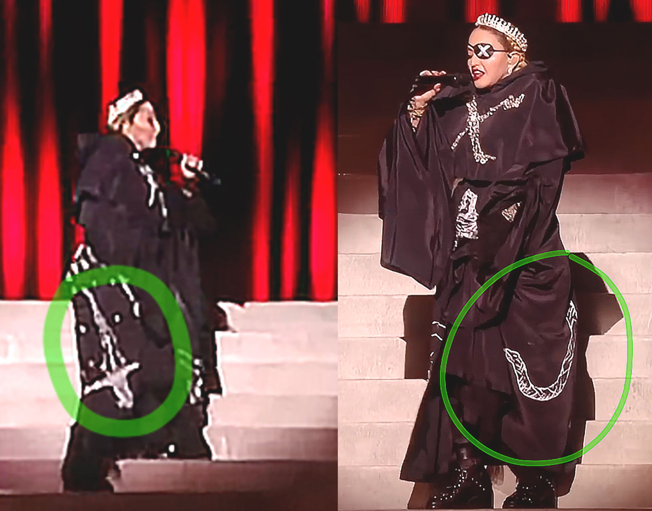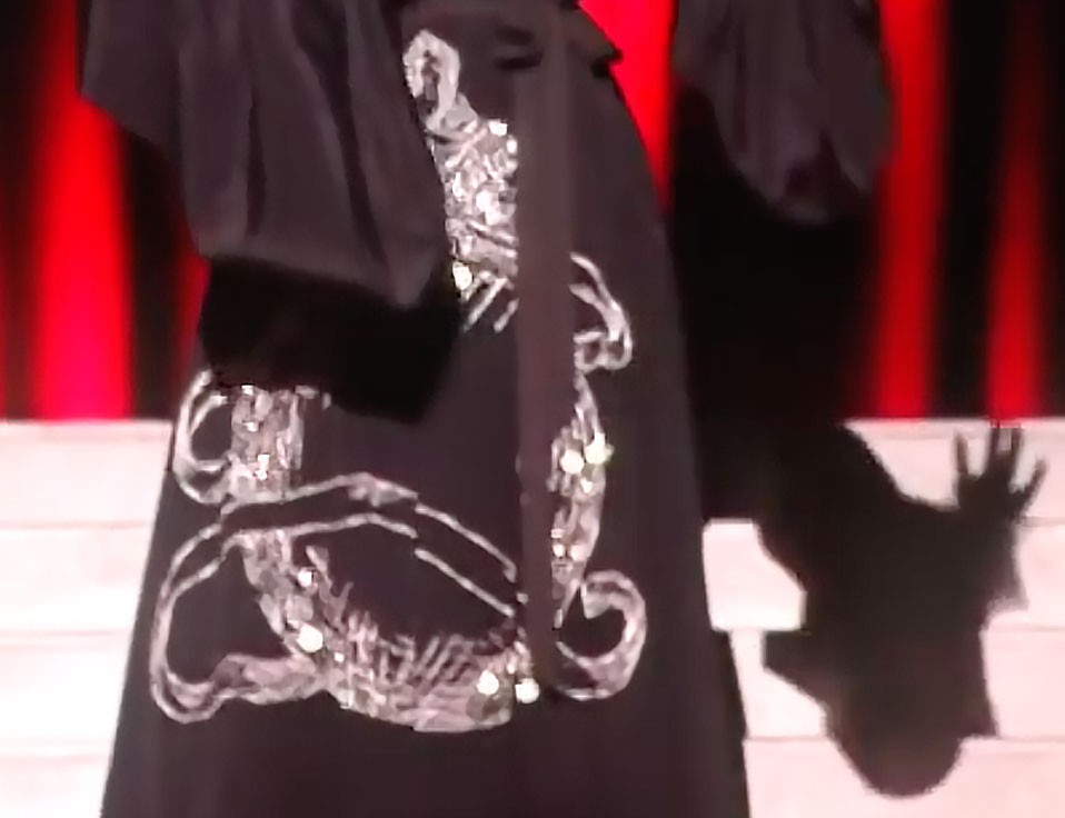 А теперь не менее занимательное «совпадение». Плащ-накидка превращается в меч и змею. Да, да именно так. Когда Мадонна вначале спускается правым боком она откидывает накидку и там вышит меч, затем она спускается левым боком, снова откидывает часть своего плаща и там вышита змея. Что это за символы? Меч, скорее всего, это по теме рыцарей, тамплиеров и далее Вы увидите как эта линия будет прослеживаться во втором наряде Мадонны на выступлении и её коллеги по сцене. А змея — ну это классика жанра. Тут уйма вариантов и все весьма зловещие. Хотя, есть мнение, что змея — это символ знаний, мудрости и т.д.