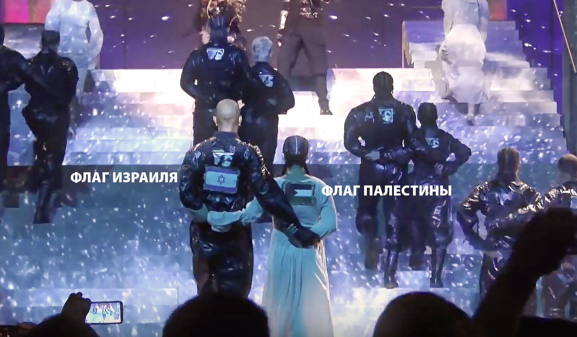 2) появление флага Палестины на выступлении.