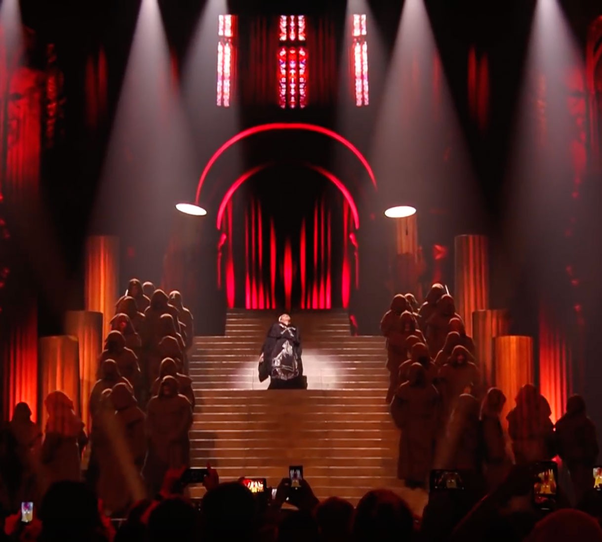 В конце выступления половина участников сцены сбросилась с «обрыва», половина спустилась по каким-то лифтам вниз. Возможно, это символ того, что кто-то спасётся под землей. После чего появляется изображение черной и мрачной церкви: