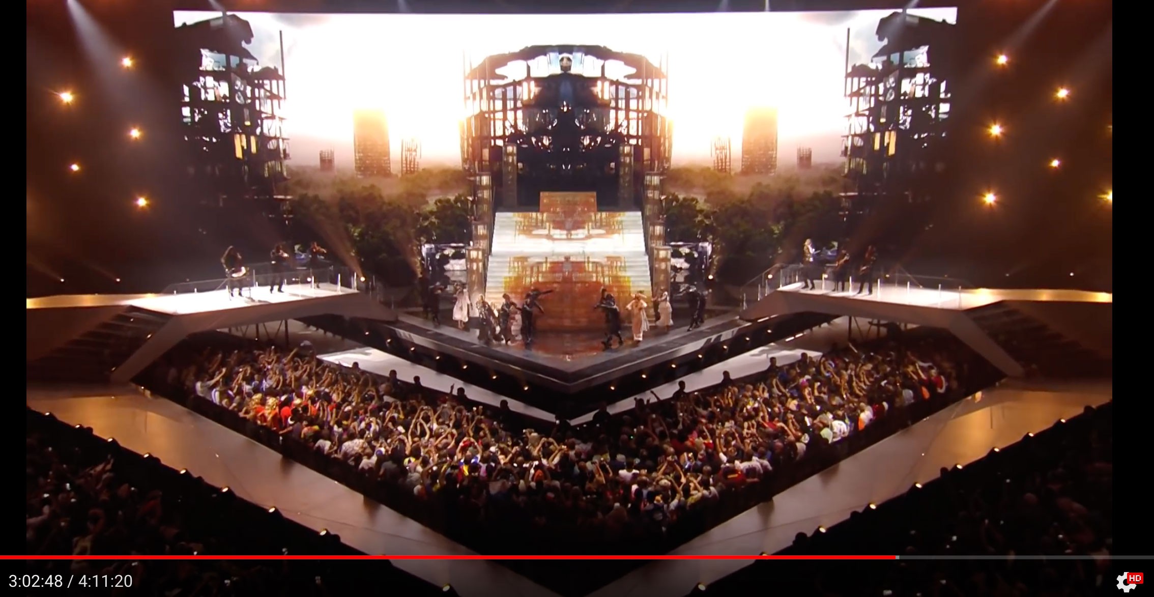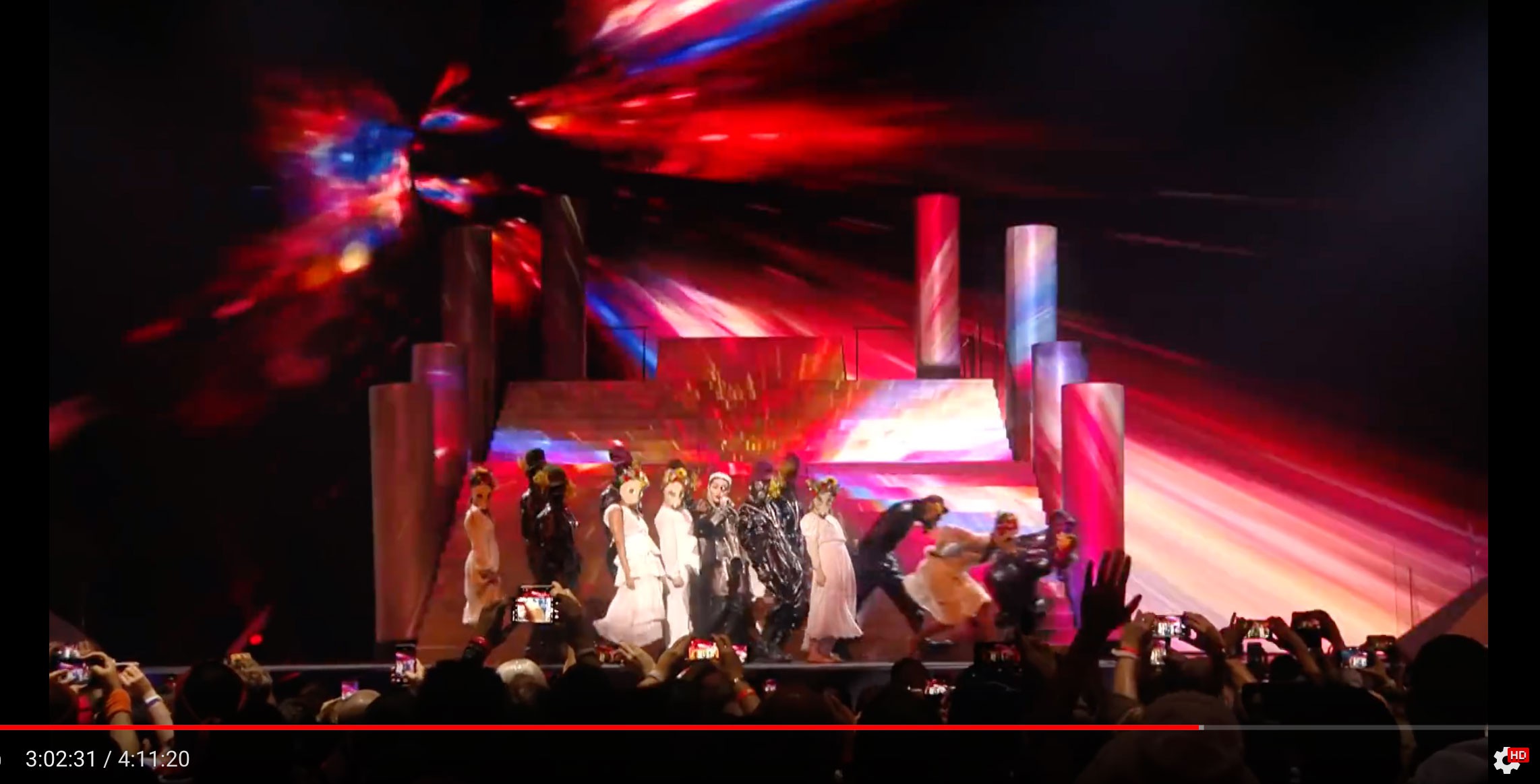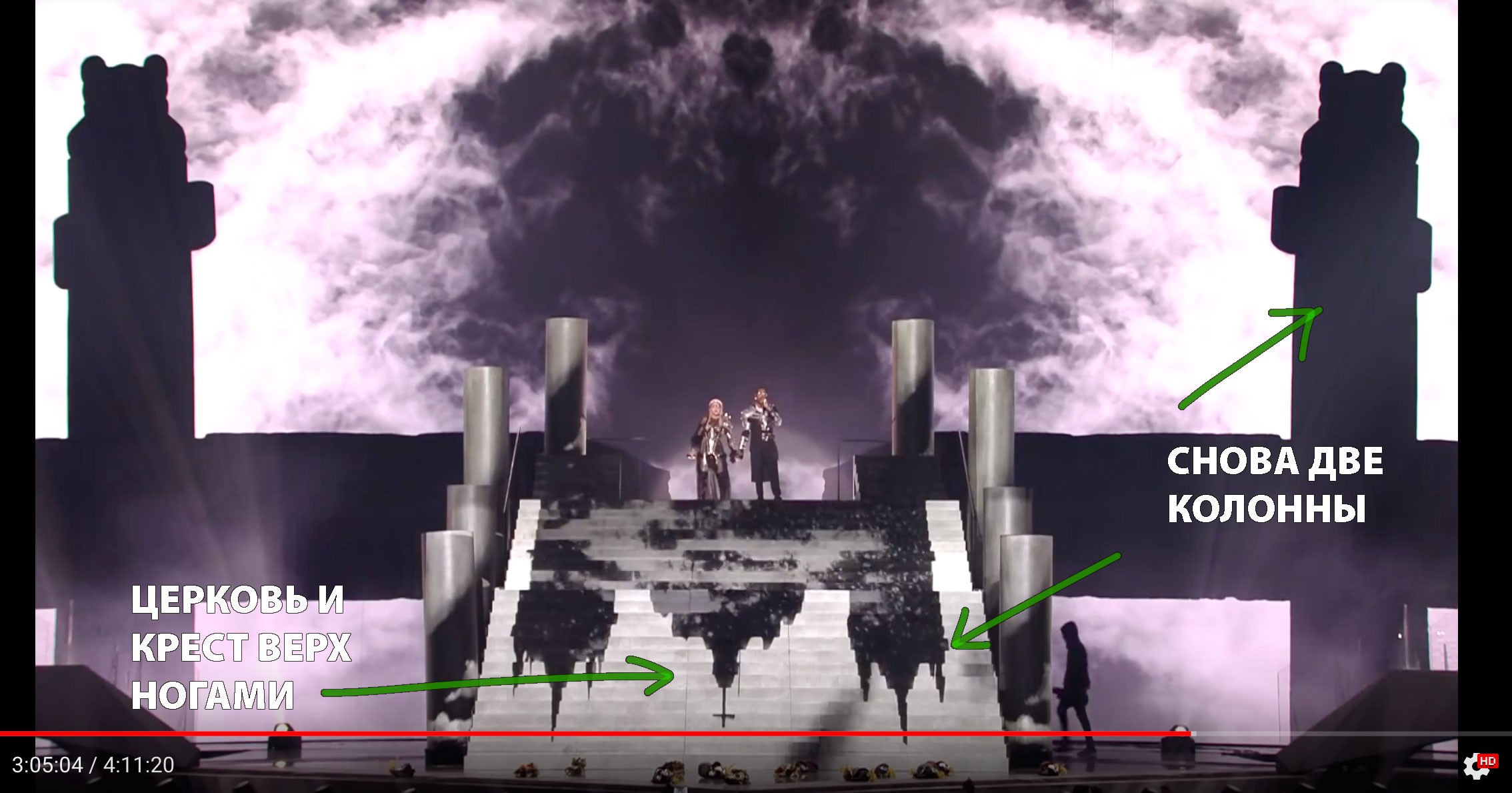 О том, что в этой песне есть слова которые при прокрутке наоборот гласят «HEAR US, SAVE US SATAN!» («Услышь и спаси нас Сатана!») я знаю давно. Если кто не в курсе этого можете сами прослушать этот тут на минуте 5.16 и проверить. Но в совокупности с такими декорациями на сцене, да ещё и на международном мероприятии (мрак, монахи, символы и т.д) возникают мысли о том, а не очередной ли это ритуал в прямом эфире по тв. Говорят, такое практикуют. А кто — вопрос оставшийся без ответа.