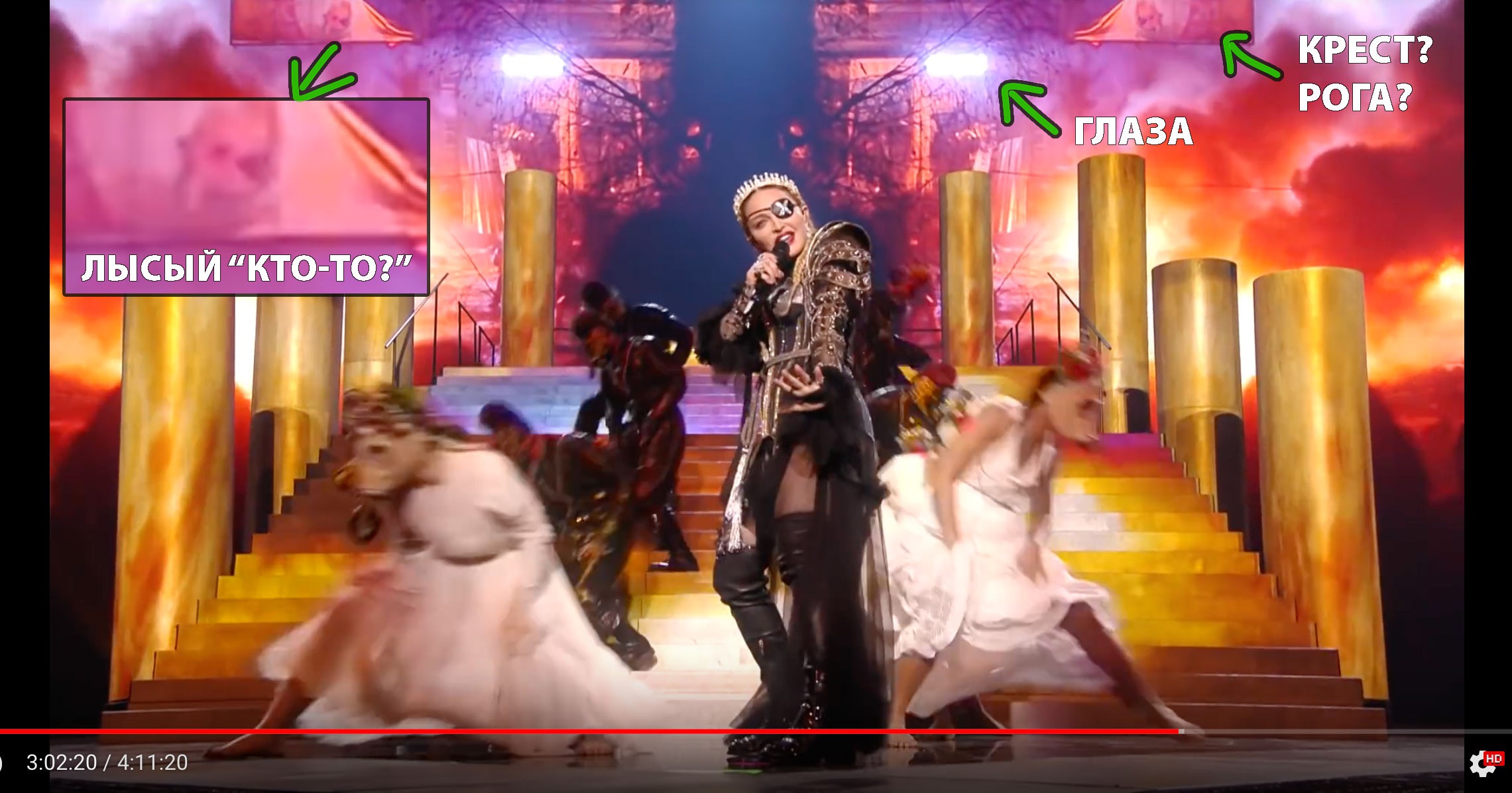 Но есть ещё фон, весьма занятный. Мадонна поёт на фоне чего-то похожего на крест.У него странные края в которых мы видим изображение кого-то лысого. Я просмотрела ближайшие кадры — этот «кто-то» там реально есть.