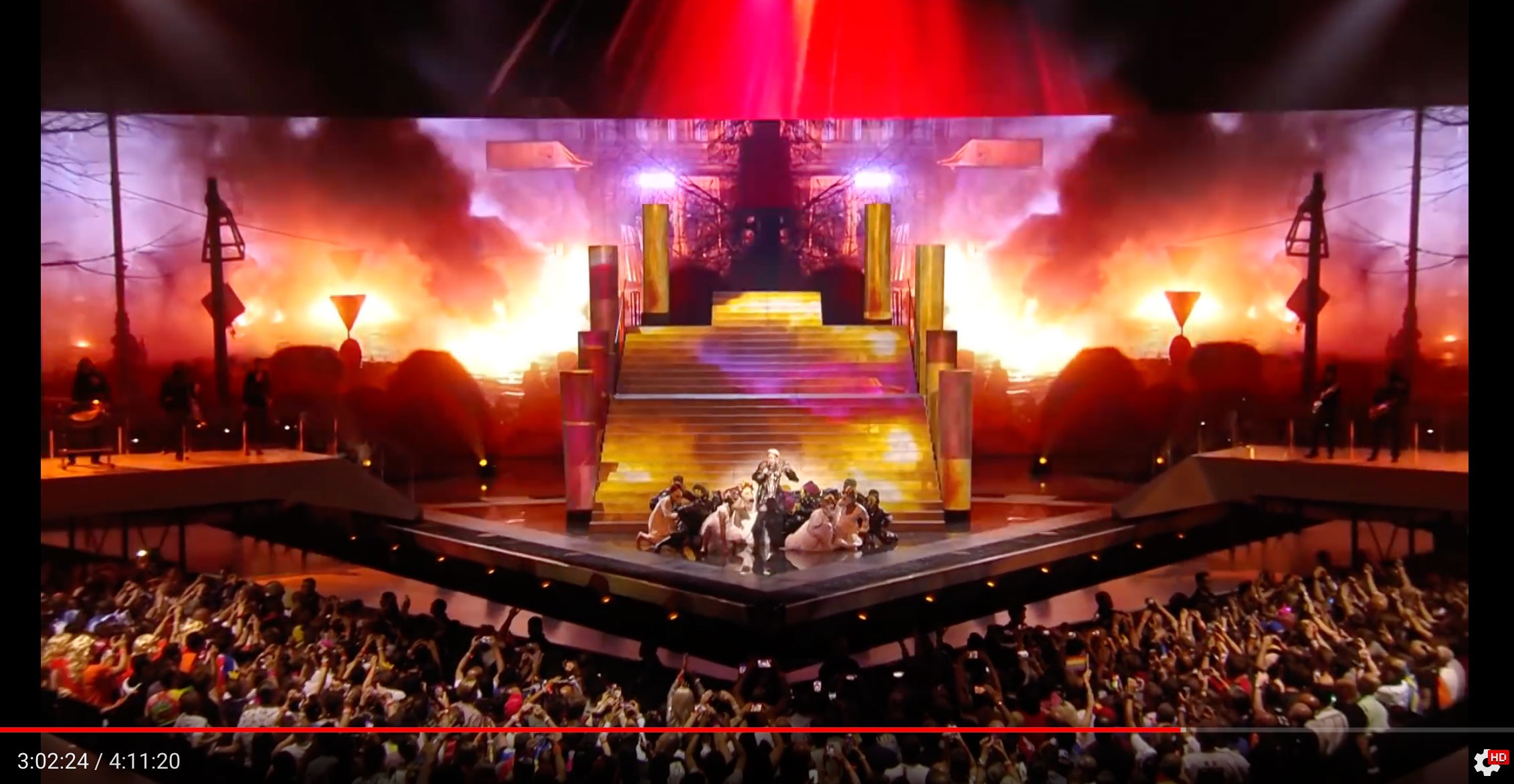 После этих слов Мадонна дует (видимо делает тот самый ветер) и всё облачается в огонь. Люди на сцене падают. Тот ветер о котором она говорит явно убивает.