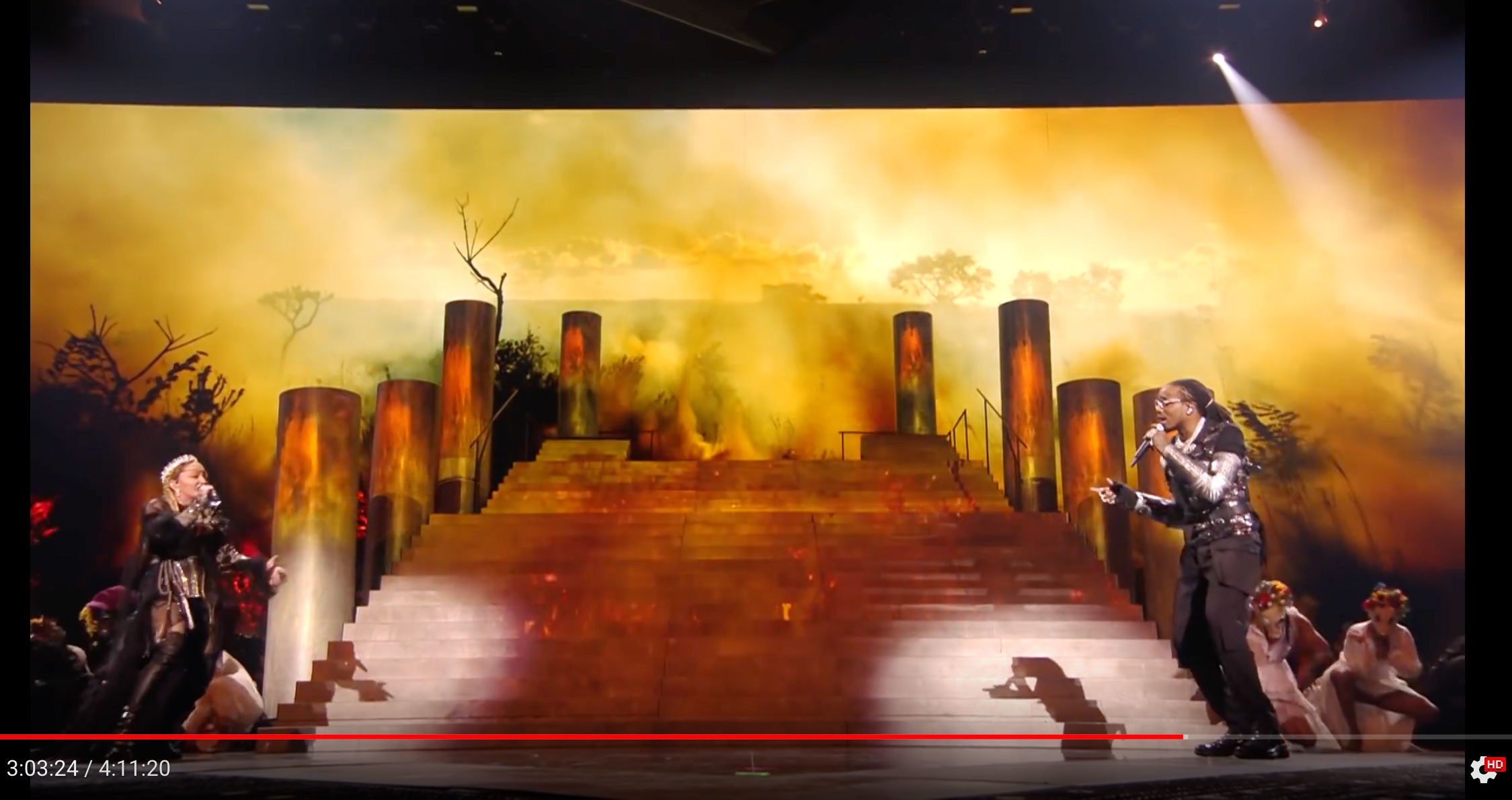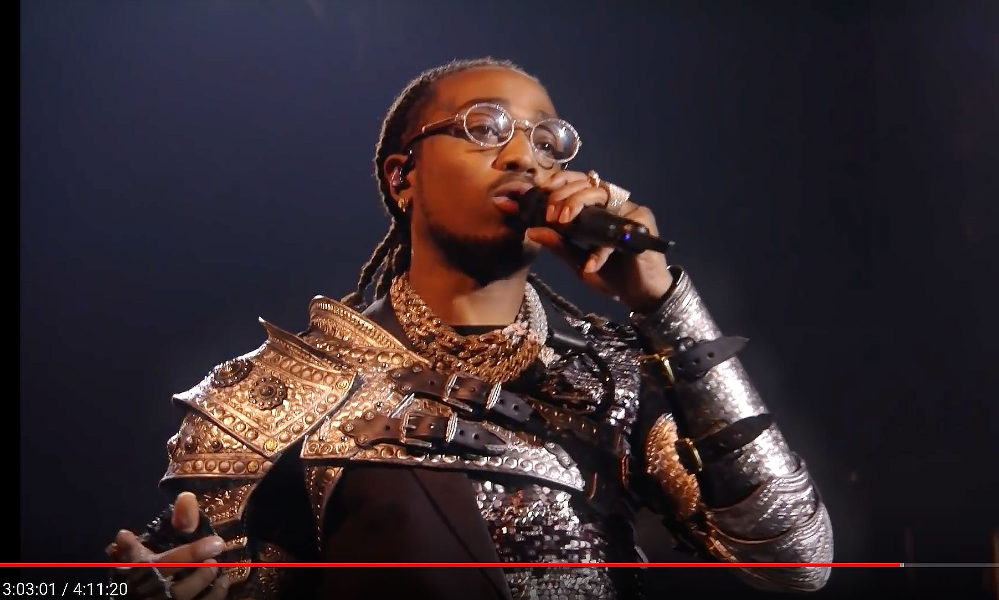 Итак, рыцарская тема продолжается и далее. Во-первых, когда с Мадонны сняли накидку оказалось, что у неё рыцарские накладки на плече. Во-вторых, когда на сцене появляется рэпер Quavo мы видим, что и он в кольчуге.