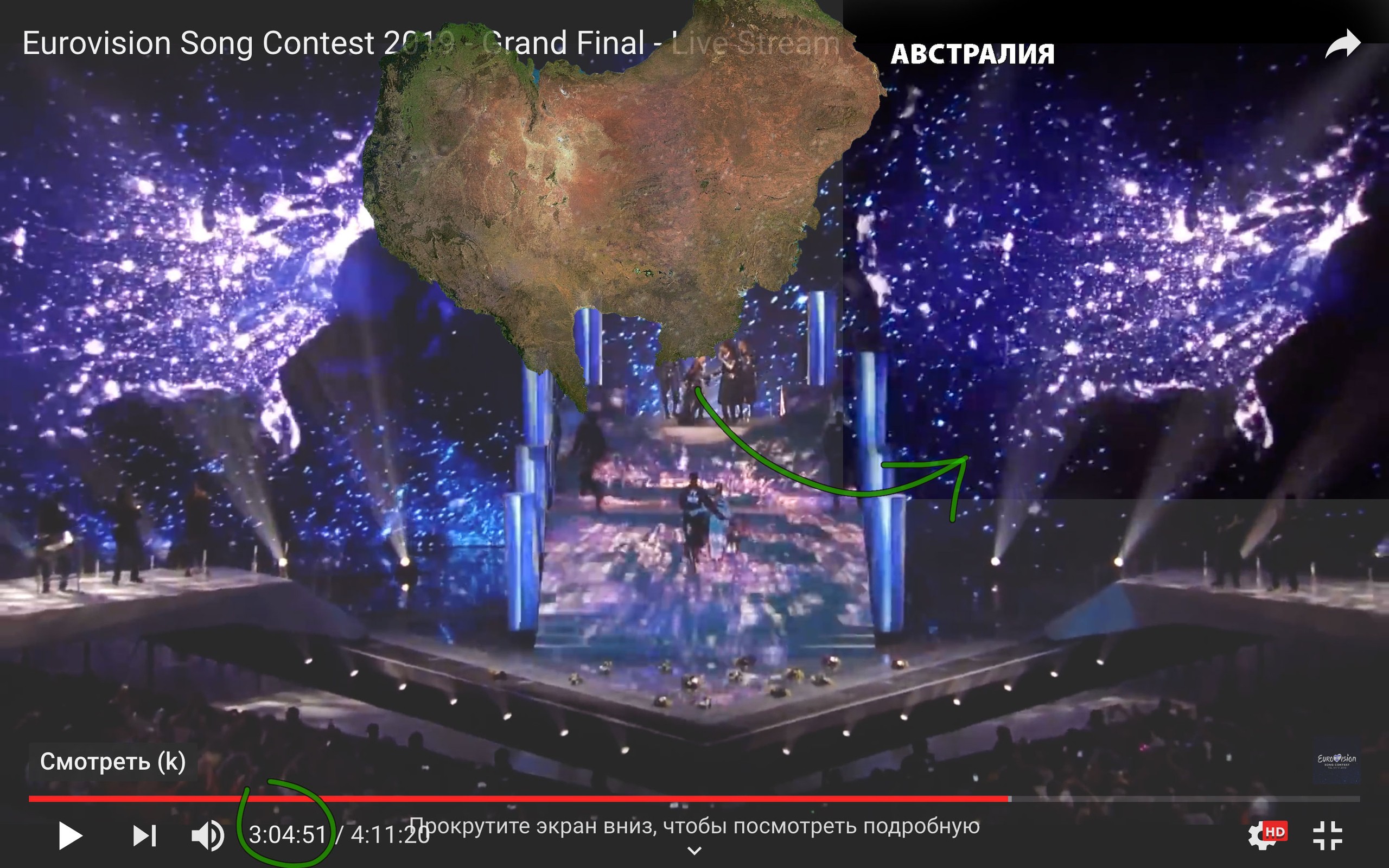 Также на фоне выступления был момент «скачка», когда видно вначале материк близко, а потом как бы из космоса и он тоже похож на Австралию. Может мы чего-то с Вами не знаем об этом волшебном месте?