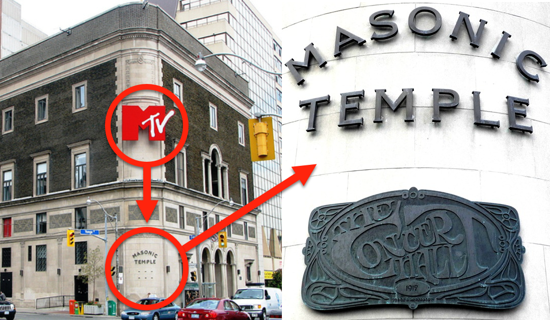 Если стать лицом к масонскому храму, на котором надпись MASONIK TEMPLE (масонский храм), и поднять голову вверх, то мы увидим надпись СТУДИЯ MTV. На сегодняшний день дьявол стал для масонов Великим Архитектором. Члены тайного общества проводят его идеи в жизнь. Мировые звезды поп-шоу вникают в тайны масонства и легко ими вербуются.