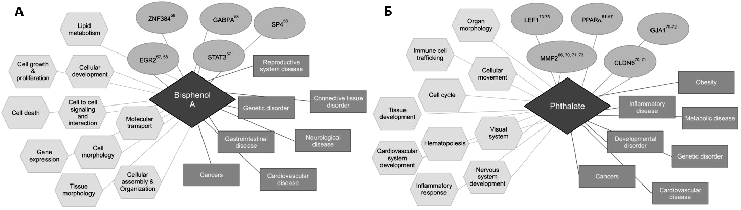 Рисунок 7. Молекулярные составляющие развития отклонений под воздействием «эндокринных разрушителей»: бисфенола А (А) и фталатов (В). Рисунок из [34]. Нажмите на рисунок, чтобы просмотреть его в полном размере.