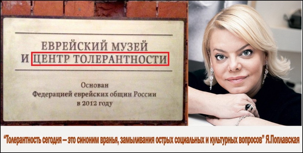 Комментарий А.Б.: Яна Поплавская абсолютно права. Ключевое слово в её высказывании — сегодня. Изначально это был исключительно медицинский термин, который происходит от латинского tolerantia — "терпеливость, переносимость". В фармакологии он означает "способность организма переносить воздействие определённого лекарственного вещества или яда без развития соответствующего терапевтического или токсического эффекта". ("Медицинская энциклопедия"). Перенос термина "толерантность" в политику стал означать только одно: политики подобно медикам стали применять определённые виды информационных ядов в отношении целых народов, с целью постепенного разрушения у психически здоровых людей их внутренних нравственных установок, которые каждый нормальный человек имеет с рождения.