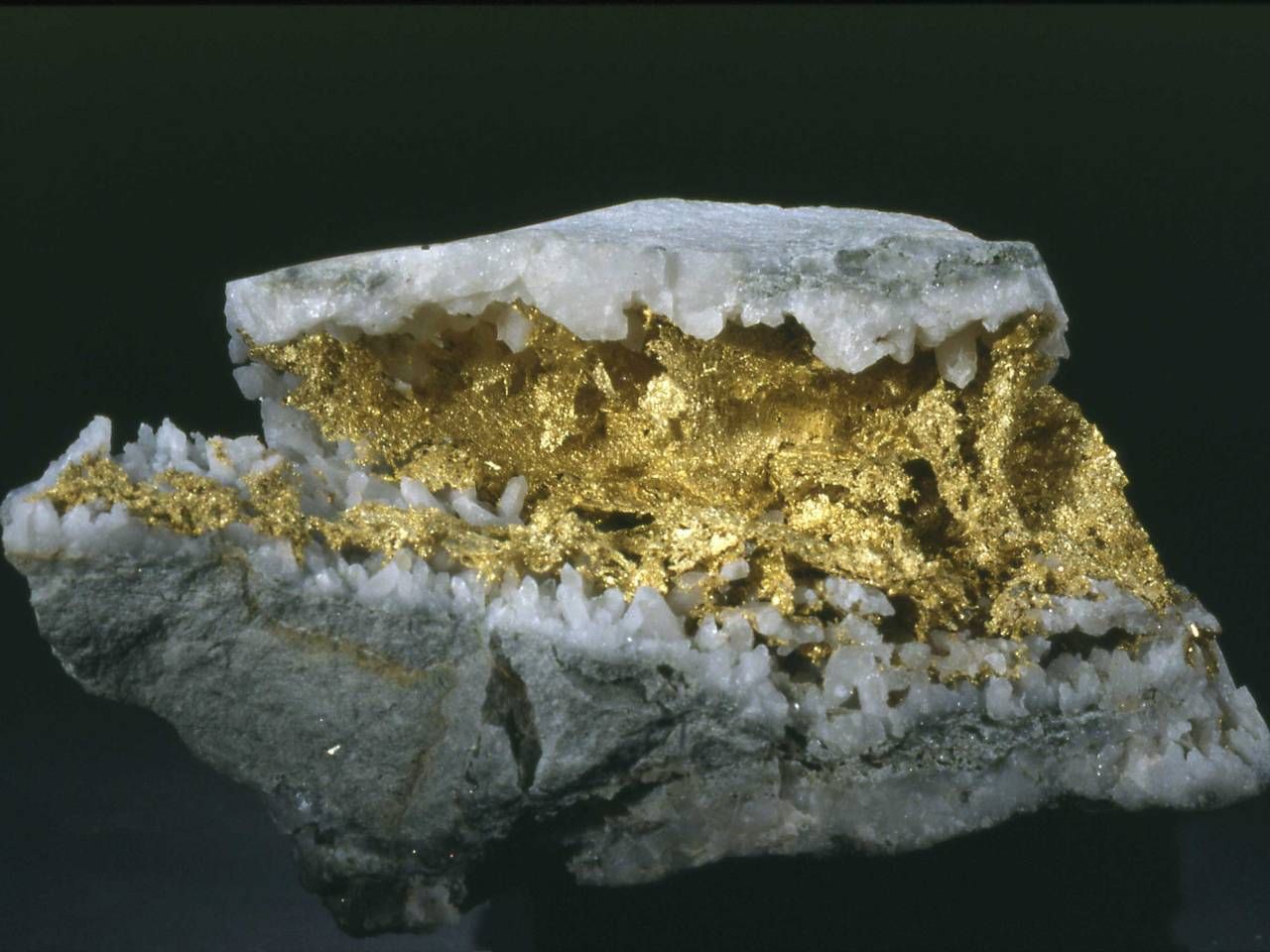 Золото в кварцевой жиле. Видно, что кристаллы кварца в этом конгломерате росли. Но как в бутерброде между ними находится золото. И тоже в своеобразной форме, не похожей на застывший расплав.