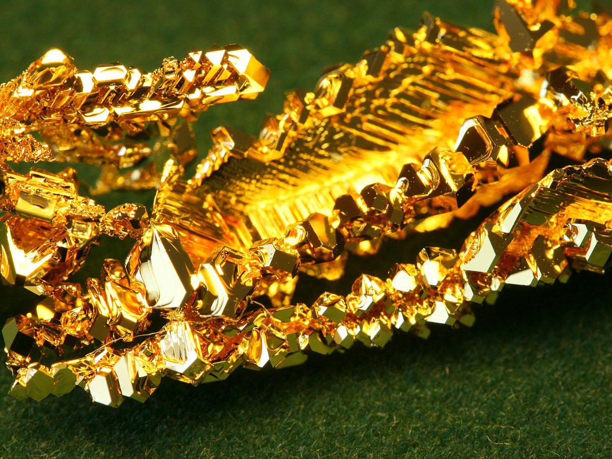 Кристаллическое золото, выращенное методом химического транспорта. Т.е. рост золота можно воссоздать и в лаборатории.