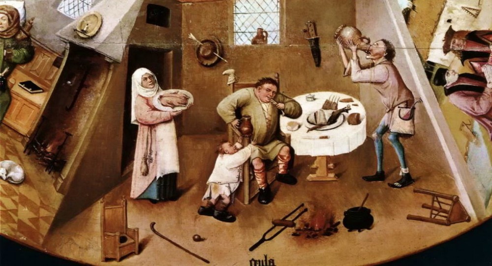 - Чревоугодие. В данном случае речь идет не только об обжорстве, но и вообще о незнании меры в чем бы то ни было. Упомянутый нами выше алкоголизм есть не что иное, как запущенная форма чревоугодия. Вместо умеренного употребления еды или пищи, необходимого для поддержания сил и здоровья, человек изрядно налегает на продукты и напитки, вредя самому себе. А еще чревоугодие открывает дорогу следующим страстям. Именно поэтому одной из составляющих христианского поста является ограничение себя в пище.