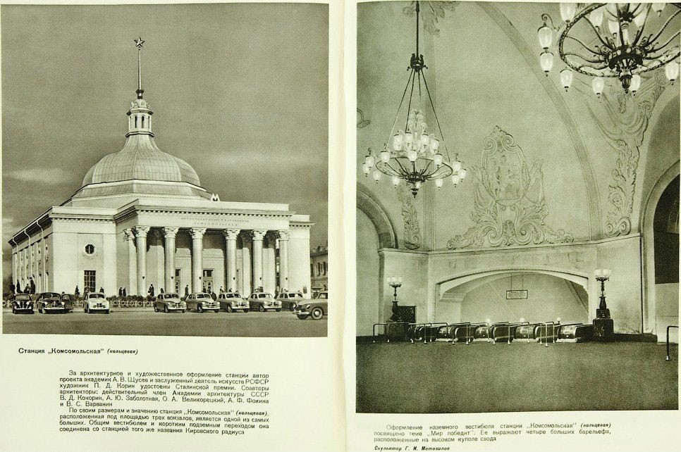 Все четыре новых подземных дворца соперничают между собой своеобразием архитектурного замысла, легкостью и изяществом форм, богатством украшений, обилием воздуха и света. Но наиболее величественным и парадным предстает перед пассажирами головное сооружение новой линии — станция «Комсомольская-кольцевая». Авторы проекта этой станции, архитектор академик А. Щусев и художник П. Корин, удостоены Сталинской премии второй степени.